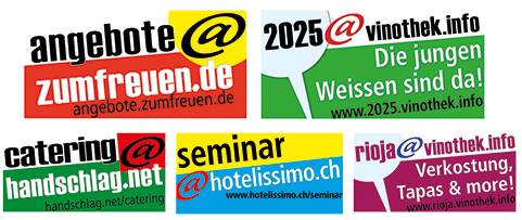 Die gezeigten Beispiele sind in Form und Farbe "frei". Grafische Gestaltung folgt immer den Wünschen unserer Kunden. Sie sehen einige unserer aktuellen e Mail Adressen und SubDomains, die viele attraktive Lösungen möglich machen ... |