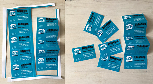 Kärtchen nach dem Druck einfach entlang der Perforation 2- bis 3 mal falten und schon lösen sie sich vom Druckbogen.